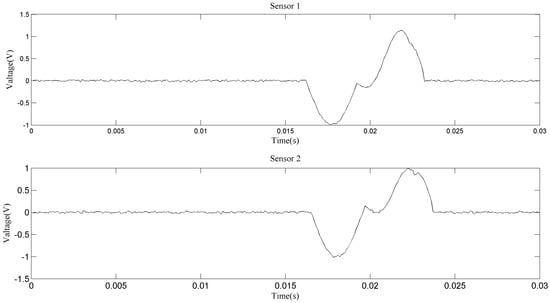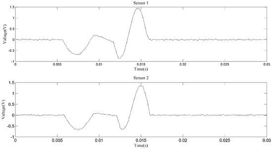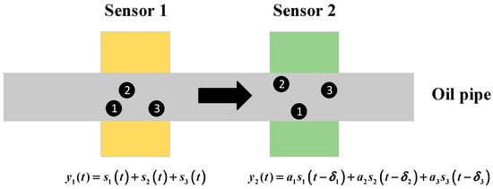 Based on the analysis above, a serial layout of detection sensors is proposed in this paper. The layout of the sensors is shown in Figure 2. Two sensors with similar performances are installed in series on an oil pipe. When the particle passes through the oil pipe, the output of sensor 1 is and the output of sensor 2 is . Since the two sensors should have a similar output for the same passing particle, the output of sensor 1 is simplified to be and the output of sensor 2 is , where and are the amplitude and the phase difference of the induced signal in comparison to sensor 1. Assuming that particles pass through the sensors with a constant speed, in a period of time , the output of the two sensors is: