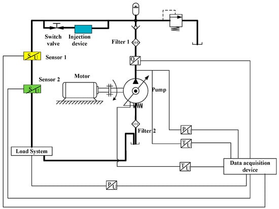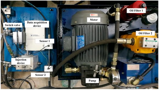 Two oil filters were installed on the input pipe and the output pipe was connected to the pump. The one installed on the input pipe was used to protect the pump from real wear by the contaminant and the other was employed to make sure that the tested part of the pipe contained only the injected tested particles. On the tested part of the pipe, a particle injection device was installed and two similar inductive debris detection sensors were installed in series. The real experimental system is shown in Figure 5.