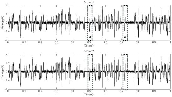 Six replicates of the experiment were carried out and signals were extracted from the original signals. The signals collected by sensor 2 were shifted in time 0.0196 s ahead to eliminate the error caused by the distance. We can easily find that there are several aliasing sections in the signals which can be extracted from the signals collection, as shown in Figure 6. The whole extracted signals were first divided into several sections. On each section, the DUET method was conducted. Two of the aliasing sections are labeled in Figure 6 as a1 and a2, and serve as the examples for the demixing. The size of the Hamming window is 64 samples. We can also see that there are sections where no aliasing occurred (there was no signal mixing). For these sections, the clustering results of the DUET method were only one source and the debris sizes couls be estimated without using the mask function.