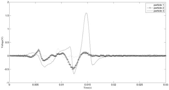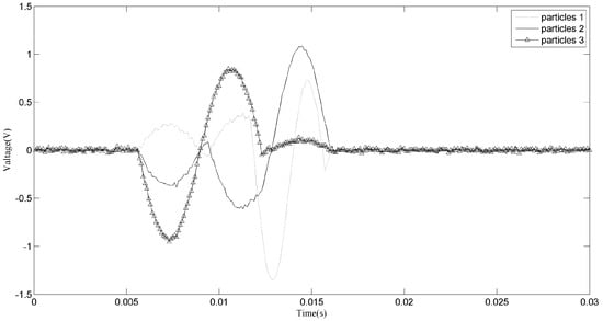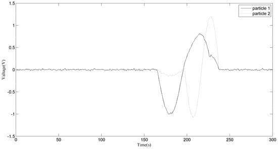 The inductive sensor generates independent pulses as long as the distances between the debris which pass through the pipes are large enough. However, if two wear particles are close enough, the two induced voltages of the radial magnetic field (RMF) sensor will be superposed and an aliasing signal will be generated, as shown in Figure 1. In such a situation, when two wear debris particles are wrongly recognized as one, both the concentration and the size of the debris will be influenced. According to Reference [1], during normal machine separation, wear debris exhibits a constant concentration and small size. The concentration and size of particles increase gradually with time when abnormal wear begins. The accumulative error caused by aliasing will influence the abrasive debris detection precision. Because of the complexity of the wear and tear of a hydraulic pump, aliasing happens more frequently in RMF detection. Due to the high flow rate, this situation is serious under certain pipe diameters.