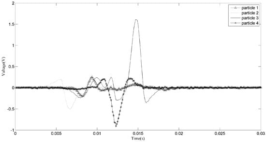 By using the injector, particles were injected into the transparent section of the pipe. Without opening the switch valve, particles will not flow with the oil. By opening the switching valve, the particles flow into the tested part of the pipe, gradually generating aliasing signals. When particles pass through the sensors, the induced voltages are collected by the signal acquisition system. Key parameters of the experiment system are listed in Table 1.