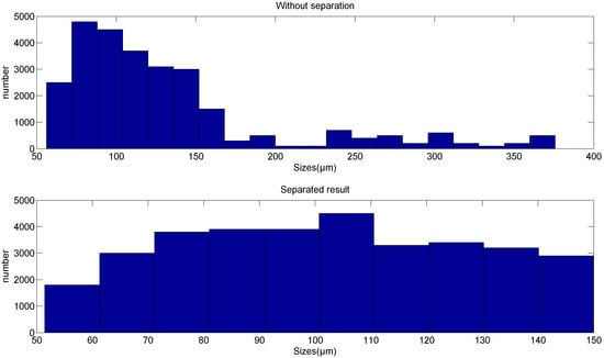 For each particle, it is already known that each particle will induce a signal similar to the sine wave. The demixing result of section a1, shown in Figure 9, and that of section a2, shown in Figure 15, are apparently acceptable solutions as debris signals. However, we also know that from the aliasing signals we may obtain different demixing results, such as those achieved for section a2, which means the demixing result may have other solutions. To verify that the results reflect the real situation, statistics about the particles sizes are calculated and the results are shown in Figure 16. From this figure we can see that without the separation, about 17.9% of all particles have sizes larger than 150 µm. Traditionally, the result without separation is believed to be the indicator for the evaluation of wear status. In fact, the particles injected into the injection device are particles ranging in size from 50 µm to 150 µm and that follow a uniform distribution, as listed in Table 1. After demixing, the separated result shows that the sizes of the particles follow a uniform distribution and the result is more consistent with the real situation than that without separation. We believe that the 17.9% wrongly estimated particles are thus reevaluated reasonably and the accuracy is improved.