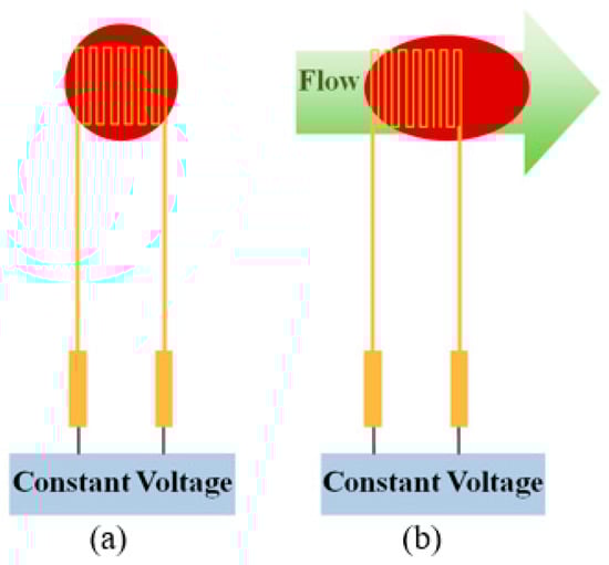 The main measurement structure of a hot-wire micro flow sensor is a resistance heater. A stable temperature field is generated by feeding a constant voltage, as shown in Figure 1a. When the fluid passes by the micro flow sensor, the temperature field is fixed with the heat of the heater, and the resistivity of the heater decreases as the fluid flow increases. The heat supplied to the hot wire is controlled, so that the temperature difference between the hot wire and flow is fixed; the heating power increases with fluid flow. The flow is converted into an electric signal and exported by constant temperature circuit design, varying with the forced convection of fluid, as shown in Figure 1b.