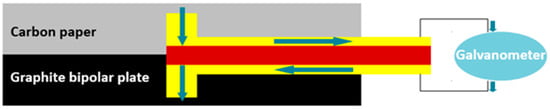The micro current sensor used in this study is a miniaturized galvanometer probe of an extension conductor. Two probes face towards the carbon paper and graphite plate respectively, and a 300 μm × 300 μm sensing area is exposed at the foremost end; the rest of the conductor is obstructed by an insulating layer; the local current is conducted to the instrument outside the proton exchange membrane water electrolyzer for measurement, as shown in Figure 3.