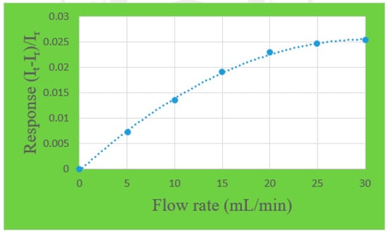 A one-runner graphite plate must be made before the micro flow sensor is corrected. The width and depth of the graphite plate are the same as the proton exchange membrane water electrolyzer. Afterwards, the micro flow sensor is embedded in the runner. Finally, the power supply, micro flow sensor and NI PXI 2575 data capture equipment are connected. The power supply supplies a constant voltage to generate a stable temperature field; the pure water measures the current variation value for flow calibration. The flow correction range is 0~30 mL/min, the unit of interval is 5, and there are seven signals extracted. The correction curve is shown in Figure 5.