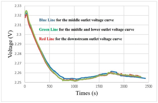 An external constant voltage must be supplied in the operation of the proton exchange membrane water electrolyzer; the operating voltage is set as 2.5 V in this study. Figure 9 shows that the measured voltage is lower than 2.5 V which may be due to the external conductor and the resistance of the proton exchange membrane water electrolyzer.