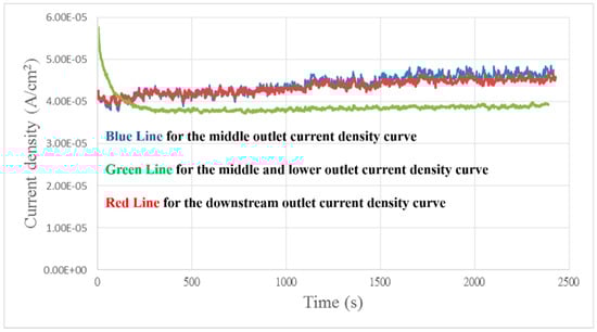 Figure 10 shows that the local current density at the downstream and midstream outlets is higher than at the upstream outlet which may be due to adequate flow through the downstream and midstream outlets. The MEA can perform a full reaction.