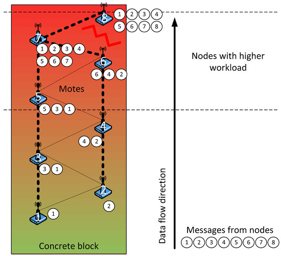 It is common practice to place steel reinforcement to provide strength against tensile stresses and avoid excessive cracking of concrete. Moreover, the wet concrete is shaped in a mould comprised of formwork, which is most commonly steel or wood, being more problematic the presence of steel for the signal transmission. Therefore, if we want to monitor the concrete curing since when it is first poured, a careful design of the wireless network topology must be accomplished since the presence of steel may degrade the transmission of data. This fact imposes a wireless network topology of linear type, which involves an asymmetry in the network. Thus, the nodes that are further away have to send data through a long list of intermediate nodes. In turn, these intermediate nodes will waste part of their energy in the tasks of rerouting data. Figure 1 illustrates the network topology and the problems related to the data traffic.