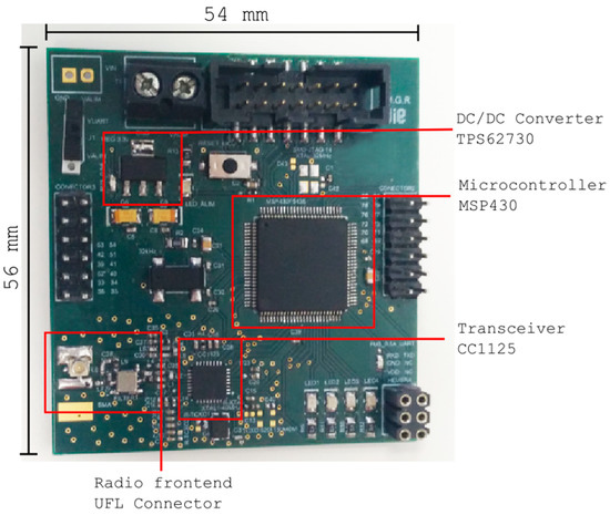 The mote consists of a microcontroller, a radio transceiver, a lithium-thionyl dichloride primary unit cell, an embedded antenna and a waterproof enclosure. The requirements of the microcontroller were ultra-low power consumption and low voltage. Two candidates were evaluated: a CC430F6137 (Texas Instruments, Dallas, TX, USA) which includes a CC1101 transceiver that allows several frequency bands below 1 GHz (868 MHz and 433 MHz), and a CC1125 transceiver, also from Texas Instruments, alongside with an MSP430 microcontroller (Texas Instruments, Dallas, TX, USA). The power supply consists of a 3.6 V battery connected to a TPS62730 DC/DC converter (Texas Instruments, Dallas, TX, USA) of 2.1 V and efficiency of 95%, especially suitable for wireless applications. The mote equipped with a CC1125 transceiver, shown in Figure 2, benefits from the excellent receiver sensitivity at low rate modes, reaching −129 dBm at 300 bps, and therefore was selected for the deployment. The dimensions of the PCB are 56 × 54 mm.