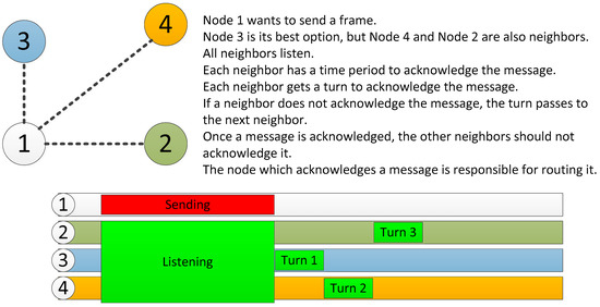 Figure 4 shows the simplified routing mechanism. First, a static routing has been chosen for power saving, but also considering the possibility of errors within the nodes. Thus, if the node 3 has low battery, it may decide not to acknowledge the message from node 1 to avoid having to route it, leaving this task to other nodes. These nodes could also reject it; then node 1 would detect that none of the nodes has accepted its message and would wait for the next turn, but this time it would include a field of alert, informing its neighbors that they must transmit the message in turns in order to spread the payload.