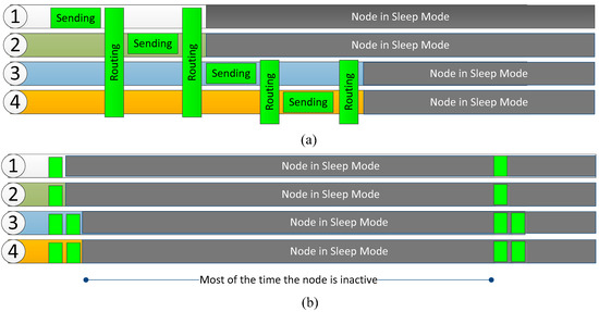 Sending messages will always be coordinated in stages as shown in Figure 5a, with an upstream direction according to their numbers as shown in Figure 1. As this network is only used for monitoring, it is only necessary to move upwards. This allows nodes with low identification number to enter the idle state first, providing a balance of energy consumption, since these nodes will be the first ones sending data (they are placed in the lower part of the concrete structure).