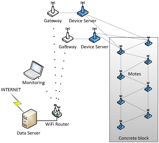 Figure 6 shows the infrastructure required for the monitoring system. It consists of the motes inside the concrete, a gateway (NPort W2150A, Moxa, New Taipei City, Taiwan) between the measurement network and the data network, a WiFi router (AWK-4121, also from Moxa), a monitoring device and a storage device.