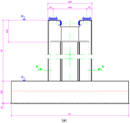 Figure 12 depicts the construction, the dimensions in centimeters and the location of each sensor. It consists of a footing to support a shaft. The dimensions of the footing are 8 × 11 × 3 m. The placement of the sensors is performed in the middle plane 1.5 m above the base. This location was carefully chosen from experimental results.