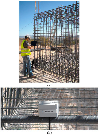 A preliminary test was performed to verify the validity of the specifications on several specimens of concrete as shown in Figure 11. Figure 11a also shows the data acquisition board used to gather physical signals from several sensors. The aim of this test is to determine if the sensors can perform inside a concrete specimen in order to replicate, as closely as possible, the construction site conditions. The specimens are created using a steel mould and filled with concrete. This test allows determining the effect of the combination of formwork and concrete on the transmission of data. In addition, the test also examines the transmission distance of the sensors. The radio transmission was tested by an emission test at fixed intervals of a data frame. As expected, the effect of concrete, rebar and formwork reduced the transmission distance of the system. When the moulds were taken out of the specimens, the transmission distance doubled. The design has been optimized to achieve a percentage of packets successfully received above 95%. The data was transmitted since the first pouring of concrete for 28 days. These results are obtained for a transmission distance of approximately two meters. Results confirmed the feasibility of the proposed approach. There were no changes in the transmission of data in the early stages of concrete pouring when it is wetter.