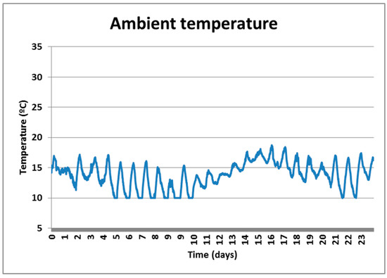 Figure 14 shows the ambient temperature profile since the first hours that the concrete is poured up to day 28, respectively. Note that the variations in temperature can reach almost 10 °C.