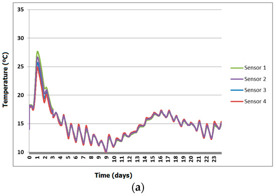 Figure 15 shows the temperature profile of the sensors located into the concrete. Note how the temperature of the concrete increased during the first hours due to the reaction between cement and water (hydration process). Once the temperature reaches a peak, then it starts to drop following the fluctuations of the ambient temperature. It can also be seen that the sensors 3 and 4 provide a slightly lower temperature, probably because they are located at the edges of the structure and the heat was dissipated away.