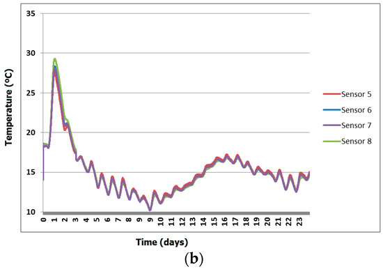 Temperature profile of concrete from sensors. (a) Sensors from 1 to 4. (b) Sensors from 5 to 8.