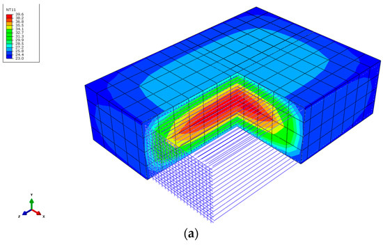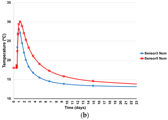 As observed from the results shown in Figure 16b, the evolution of the temperature with age predicted by the numerical model is in good agreement with that measured by the sensors placed in the structure. Obviously, the values of the numerical prediction are not exactly the same than those obtained experimentally because of several factors, which are difficult to consider in the model. For example, variation of the room temperature between day and night was not considered, the film coefficient was estimated from literature [19] and not experimentally obtained, and the temperature of the soil was also estimated, etc. However, the maximum values of the temperature given by the sensors, the age at which these values were obtained and the evolution of the concrete temperature after the peak value (cooling) are quite similar, which reflects the reliability of the experimental measurements.