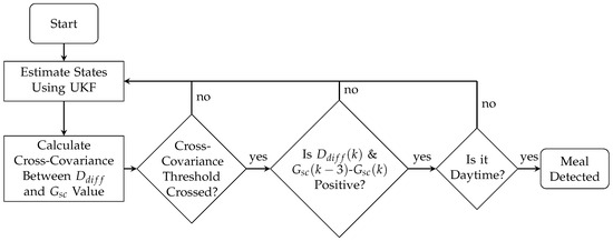 Flow chart of the meal detection algorithm. First, the states of a minimal model are estimated using an Unscented Kalman filter (UKF) and then the cross-covariance is found between the state estimation for the forward difference of the disturbance parameter () and the glucose value obtained from a continuous glucose monitor (CGM). A threshold is applied to the cross-covariance, and, once crossed, the last unscaled value of and the slope with respect to the measurement 15 min ago (3 samples) of are checked, if both are positive and it is daytime, a meal is detected.