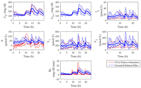 The in silico state estimations of the UKF were compared to the model states of the UVA/Padova Simulator and the populational values are shown in Figure 4. The root mean squared error (RMSE) between the UVA/Padova Simulator and the UKF was calculated for each of the states over a 14-day period. The RMSE values of the mean populational values for , , , X, , , and were found as 5.8 mg/dL, 0 mg/dL, 3.7 pmol/L, 25.6 pmol/L, 43.2 pmol/L, 60.1 pmol/L, and 2.8 mg/dL/min, respectively.