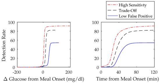 A 500-day simulated scenario was used to perform a sensitivity analysis. The amount of carbohydrates consumed per meal by the 10 adult subjects had a mean of 70 ± 29 g and a median of 70 (25, 116) g. The population performance metrics can be found in Table 3, which, when compared to the three-meal algorithm tunings in the previous section (Section 3.2.1), shows a decrease in sensitivity for both the high sensitivity and trade-off tunings with mean values of 92 ± 3% and 82 ± 4% and median values of 92 (87, 96)% and 83 (76, 87)%, respectively. The low FP tuning, however, showed an increase in sensitivity with a mean value of 54 ± 9% and median value of 52 (44, 71)%. The FP/day between scenarios are roughly the same. The FP/day of the high sensitivity scenario for the tuning and validation scenarios and the sensitivity all shared a mean of 1 ± 1 and a median of 1 (0, 3). The FP/day in the trade-off scenario also had a similar value for the sensitivity analysis with a mean 0.2 ± 0.5 and median 0 (0, 1) versus mean 0.2 ± 0.5 and 0 ± 0 and median 0 (0, 1) and 0 (0, 0) of the tuning and validation scenarios. The FP/day in the low FP scenario was only slightly higher with a mean value of 0.02 ± 0.2 and median 0 (0, 0) versus mean 0 ± 0 and 0.01 ± 0.1 and median 0 (0, 0) and 0 (0, 0) in the tuning and validation scenarios. Figure 5 illustrates the cumulative detection rates over change in time and glucose from the onset of meals for the three meal algorithm tunings and further emphasizes that algorithms with higher sensitivities have a shorter detection time and lower glucose at detection.