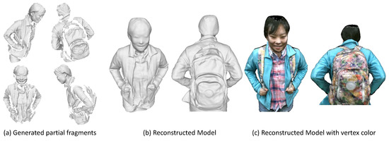 Recently, as an extension to the KinectFusion system, Newcombe et al. [16] has proposed the dynamic fusion approach that takes non-rigid motion into account with a non-rigid warp field updated with respect to every frame. The current input gets fused to the canonical model under the current warp field. Later on, Ref. [17] incorporates sparse feature matches into the framework to resolve the ambiguities in alignment. Guo [24] takes advantage of the dense color information to improve the robustness of surface tracking. They have also decomposed the lighting effect from the image to eliminate the color variation affected by the environment lighting. Yu et al. [25] enforce the skeleton constraints in the typical fusion pipeline to get better performance on both surface fusion and skeleton tracking. Those methods allow the user to move more freely. However, they haven’t dealt with the loop closure problem, which makes them not suitable for complete model recovery considering the almost inevitable drifting problem as the sequence proceeds. This issue has been addressed in paper [26] with the proposed non-rigid bundle adjustment method. They have obtained some pleasant results, but the bundle adjustment could be quite expensive and time-consuming due to the number of unknowns and also the search space being quite large. In addition, the recovered color maps of the 3D model is blurry as they haven’t incorporated any color information. In this paper, we will deal with the loop closure problem in a more efficient way. Finally, a complete 3D model together with clear color maps will get reconstructed.
