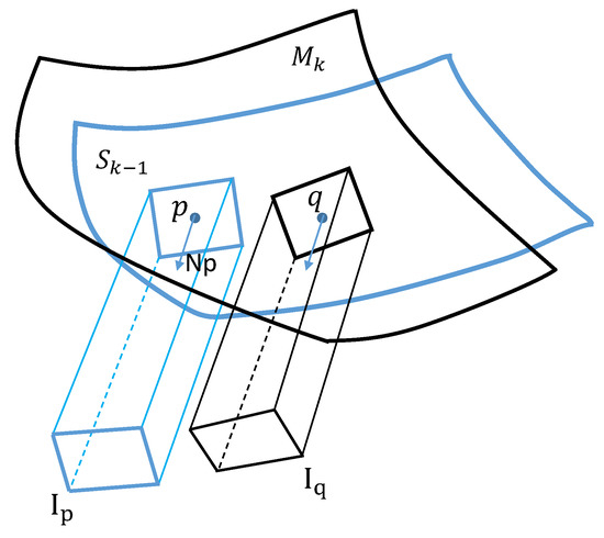 Now, suppose we have a pixel p in that has its corresponding pixel q in , which has been acquired from the computed flow field. For pixel p, we have its corresponding vertice on mesh denoted as . Its neighboring vertices within some certain distance on the mesh can be extracted. In addition, we make use of the geodesic distance here to keep the extracted neighboring vertices to be connected. The corresponding pixels for those vertices on the rendered image are denoted as . With the computed flow field, we can obtain the correspondences of on the mesh . Those corresponding vertices are denoted as .
