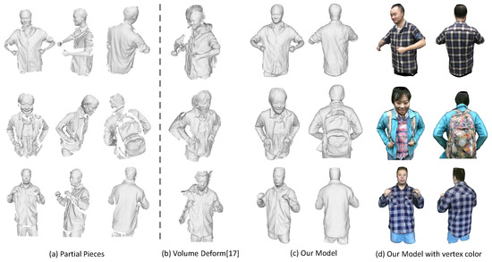 Qualitative evaluation on full body models. (a) some sampled partial pieces; (b) the results from VolumeDeform [17]; (c) the complete models we get with our approach; (d) our recovered colored models.