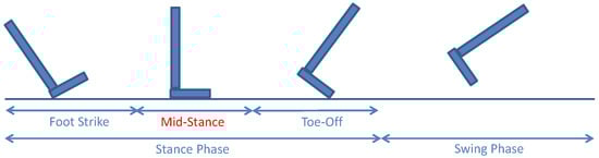 The gait cycle can be divided into two phases, namely stance and swing. The stance phase applies when the foot is in contact with the floor and the swing phase when the foot is in the air. Within the stance phase, the foot strike, the mid-stance and the toe-off can be identified, as shown in Figure 2.