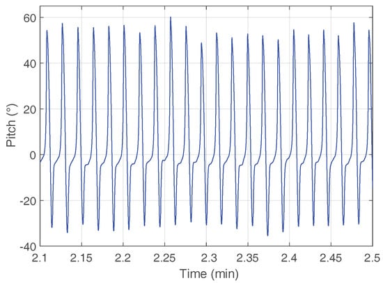 As the figure shows, if the pitch angle estimation is around zero, the foot is resting on the floor. When the pitch angle estimation increases between 50° and 60°, the foot is under the toe-off phase until the middle of the swing phase (see Figure 2). Then, the pitch angle estimation decreases until −30°, which corresponds to the strike phase. Finally, the foot returns to zero and performs the mid-stance phase.