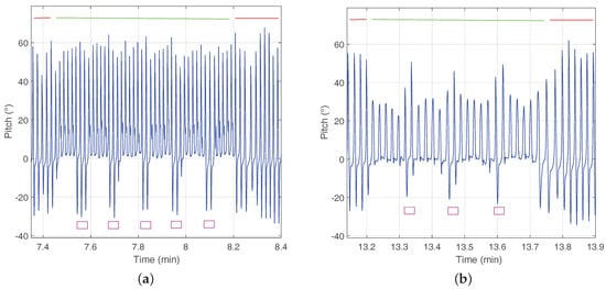 (a) Shows in blue the pitch estimation walking down stairs and (b) walking up stairs. The red upper line highlights the pitch estimation corresponding to walking horizontally and the green line highlights the pitch estimation walking on stairs. The magenta rectangles highlight the landing zone of the stairs, which corresponds to walking horizontally.
