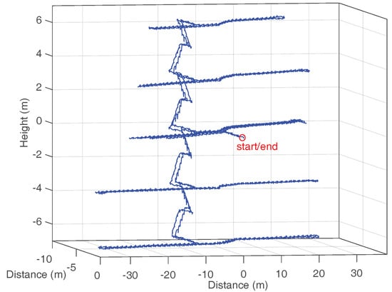 The test building is the Institute of Communications and Navigation of the German Aerospace Center in Oberpfaffenhofen, near Munich (Germany). The length of the building is approximately 68 m, and the width of the building is approximately 17 m. In our experiments, we used three points per floor, at the ends of the corridor and in the middle, and additionally one starting point close to the middle point of the second floor. The final point of the walk is the same as the end point (see Figure 5). A dataset of 3D walks was recorded in order to evaluate the proposed HUPT correction. The trajectory of the walks covers all five floors of the test building.