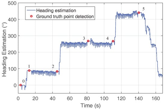 Figure 7 shows the heading estimation corresponding to the beginning of the walk, i.e., second floor and stairs, recorded by one of the volunteers. The automatically-detected ground truth points are highlighted with red circles. These points are labeled corresponding to the points shown in Figure 5.