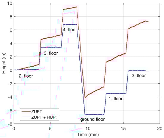 The error in z-axis or height error is computed according to Equation (7) using all ground truth points over the five floors for each of the 20 walks. Figure 8 shows the height estimation corresponding to the walk of one of the volunteers. Since the start and ending point is the same, the final estimated height should end at 0 m. The red curve shows the height estimation using ZUPT corrections only, and the blue curve has been estimated using ZUPT and HUPT corrections.