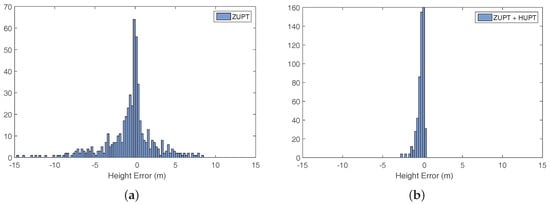 The evaluation of the error in height corresponding to 534 passes of reference points among all recorded trajectories is presented in Figure 9 using histograms. In order to see the distribution of the error, the sign has been taken into account. Figure 9a shows the distribution of the height error using only ZUPT corrections. Figure 9b shows the distribution of the error using ZUPT and the proposed HUPT correction. The histograms show that the proposed HUPT correction successfully reduces the error in height.