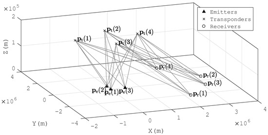 Consider that there are D emitters located at and L passive transponders placed at . The signals transmitted by the emitters are reflected by the transponders and intercepted by N receiving arrays. Each array includes M antennas. The centers of the arrays are located at . It is assumed that the locations of the transponders and the receiving arrays are known a priori and that the signal waveforms are unknown. The scenario is depicted in Figure 1.