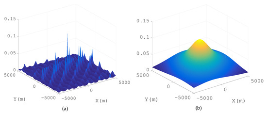 In addition, it is necessary to down convert the Radio Frequency (RF) signals to baseband signals firstly to avoid the multi-peak searching of the cost function (see Figure 2). The suboptimal peaks in Figure 2a are caused by the carrier wave. The higher the frequency of the carrier, the more suboptimal the peaks in the cost function. Besides, there is only one peak in the cost function for a baseband signal positioning model (see Figure 2b). Figure 2b is an up envelopeof Figure 2a. If the cost function is a surface with multiple peaks, it is difficult to develop a searching strategy except for a high density grid searching. However, it is easy to get the global optimal solution for a continuous function with a single peak (e.g., Steepest Descent Method (SDM), Newton Method (NM)). In a baseband signal positioning application, , where is the wave length corresponding to the maximal frequency of the baseband signal, and R is the radius of the circle receiving array. If , it is easy to satisfy , and is near singular.