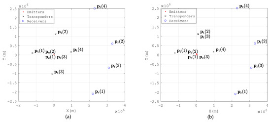 In another application, the transponders are installed on a mobile platform (e.g., Unmanned Aerial Vehicle (UAV) platform or satellite platform). If one transponder is relatively close to another transponder, or two transponders and a receiving station are near collinear, this makes . In this situation, the conditions in Theorem A2 in Appendix A are satisfied, and turns out to be near singular.