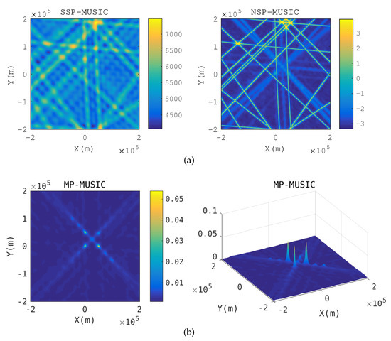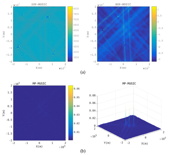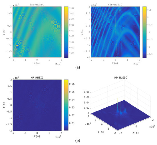 The spatial spectrum of the emitter positions requires only a three-dimensional searching, and the size of is , which is usually rather small. The detailed procedure of the MP-MUSIC algorithm is represented in Algorithm 1.