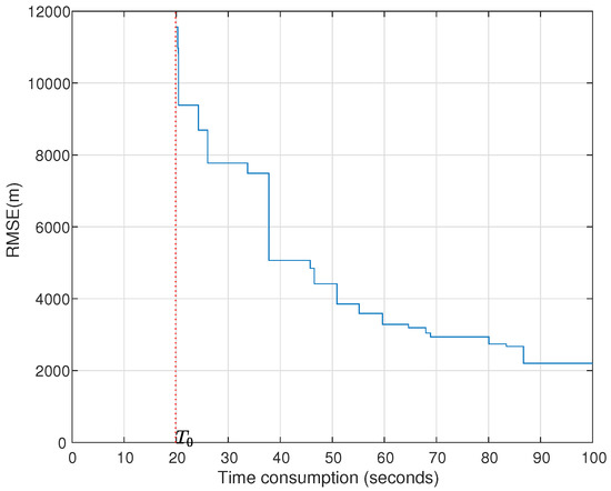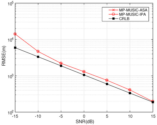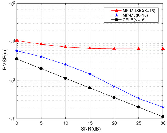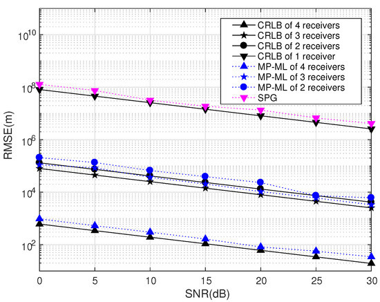 Figure 16 only gives the RMSEs and CRLBs when , since the RMSE turns out to be unstable and the CRLB turns out to be when . This can be explained by the algebra principle that the number of unknown emitters cannot be greater than the number of transponders.