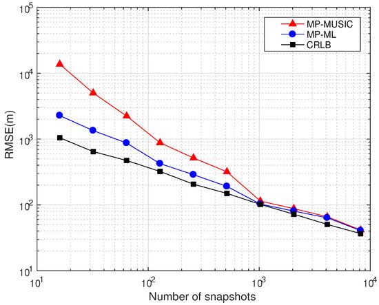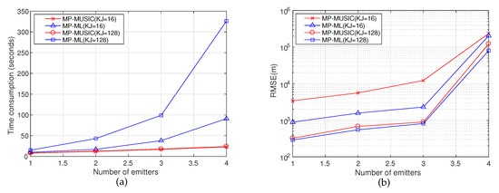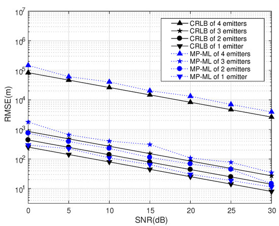 The numerical simulations and CRLB results demonstrate that the performance of MP-ML is influenced by the number of emitters. If , the number of emitters has only a slight effect on the performance of MP-ML, and if , the performance will decline significantly. If , MP-ML cannot find any emitter at all.