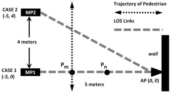 In this experiment, the AP is fixed at (0, 0) and two cases for MPs are designed as shown in Figure 1. These two cases present a preliminary calibration for the experiments setup in the following performance evaluation section, in which the longest LOSL is the same situation as that given in Case 2.