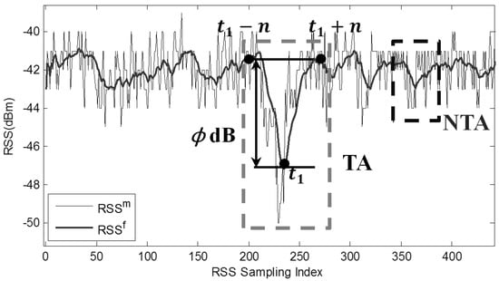 where is the measured raw RSS value at time index . represents the RSS value after filtering. is the weight, and it is assigned by the ruler , which means that the currently measured RSS values are assigned with a larger weight; in this way, we can mitigate the phase shift problem and improve the real-time performance of the system. The RSS information is presented in Figure 2, when an LOSL is triggered at time index . Here, we define that an attenuation action with amplitude dB is measured at the time index , if the filtered RSS value at the time index is the bottom of a valley with dB depth, which can be mathematically denoted by: