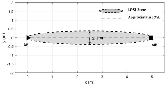 where and are the distances between the target and the two ends of the LOSL, and is the length of the LOSL. According to this model, the LOSL zone is an elongated ellipse area (the two focal points of the ellipse are the AP and MP) when the mean of attenuation is given (see Figure 3); here, we term this area as the LOSL zone and approximate this LOSL zone as a straight line.