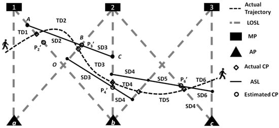 The CP estimation methods mentioned above are conducted for scenarios in which the MPs and APs are predetermined as a known constant topology. In this section, we introduce the approach of CP estimation when the MPs’ position is no longer considered as an explicitly known value. Generally, in dynamic WSN scenes, the APs are always fixed at known coordinates (e.g., sink nodes) while the MPs are sometimes free mobile nodes (e.g., handheld terminals). To estimate the CPs of a device-free target on LOSLs between MPs and APs in such dynamic scenes, active positioning should first be performed to establish the MPs’ instant coordinates. Plenty of research studies have focused on the active positioning field; therefore, here we will not present the active positioning algorithms for locating MPs but will rather discuss how to estimate CPs when the MP position is established with deviation.