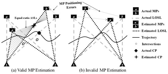 If the position of MPs is no longer certain, and is assumed to be instantly acquired through active location techniques with estimation error, the CP estimation will surely be deteriorated. In the worst cases, the larger MP estimation deviations will completely distort the ground truth topology, as previously mentioned in Figure 7. Fortunately, the LOSL triggering sequence is measured under the topology of ground truth, which means that it can be used to identify whether the estimated position of MP is qualified for CP estimation (we could even consider using the LOSL triggering sequence in turn to refine the active positioning performance of the MP).
