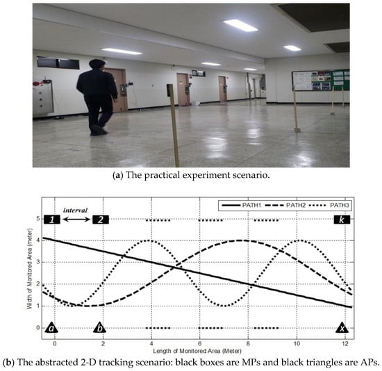 The passive tracking method adopting radio frequency tomography has been recently addressed as an emerging issue in wireless peer-to-peer networks. A conventional approach is based on the offline-training and online-matching methodology. For an example, the extension system of Reference [1]—Nuzzer—was introduced in a Wi-Fi environment [13]. Two phases are disposed in this system: a radio map that stores information on the signal strength at different locations in the area of interest is constructed during an offline phase, while during the online phase, the Nuzzer system uses the signal strength samples instantaneously received from the APs at the MPs and compares them to the passive radio map to estimate the location of the tracked entity. Similar works are referred to in Reference [14]; for example, Viani et al. divided the domain of interest into square regions and used a Support Vector Machine to train the a priori relationship between the target’s location and RSS measurements. In the testing phase, the a posteriori probability is then used to locate the target in a region by fusing the RSS measurements of all LOSLs with the a priori relationship. Other, similar works that adopt such a two-phase approach can be found in Reference [9].