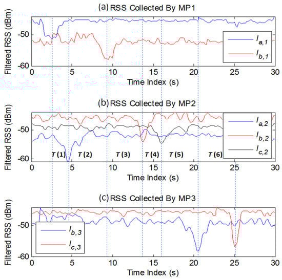 The measured RSS after filtering when three AP-MP pairs are distributed across the monitoring area (MP interval = 6 m).
