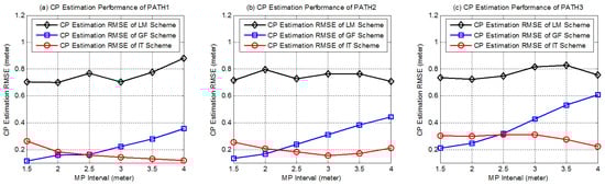 After 100 independent practical experiments, the root mean square errors (RMSEs) of CP estimation under various MP intervals for each path are shown in Figure 10. As shown in the figure, the performance of the GF scheme, which is mostly lower than 0.5 m, and that of the IT scheme, which is lower than 0.4 m, significantly outperform that of the LM scheme, which is around 0.8 m. This is reasonable because the LM scheme does not utilize any other information except for the LOSL triggering sequence. Inversely, although the accuracy is not good enough, the LM scheme is free from many limitations and more practical than the other two schemes.