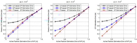 Abandoning the invalid MP location estimation according to Figure 7, the ERT method is adopted for CP estimation for the IT scheme, and the CP estimation performance via MP positioning deviation is given is Figure 11 after 1000 Monte Carlo ensemble runs.